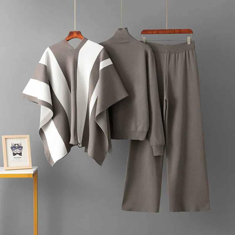 Elevate your wardrobe with this 2025 French Fashion Striped Knitted 3-Piece Suit for women. Featuring a shawl, high-collar sweater, and wide-leg pants, this elegant set combines contemporary style with classic sophistication.