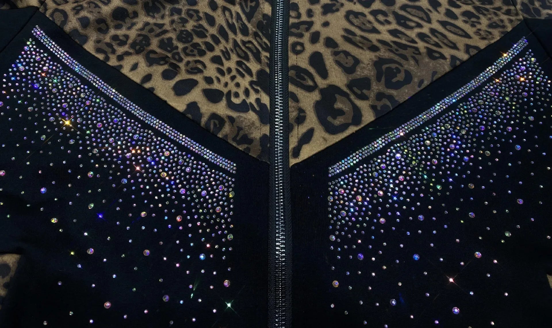 Leopard Printed Drilling Coat Sequined Diamonds Jacket Suits 2pcs Set