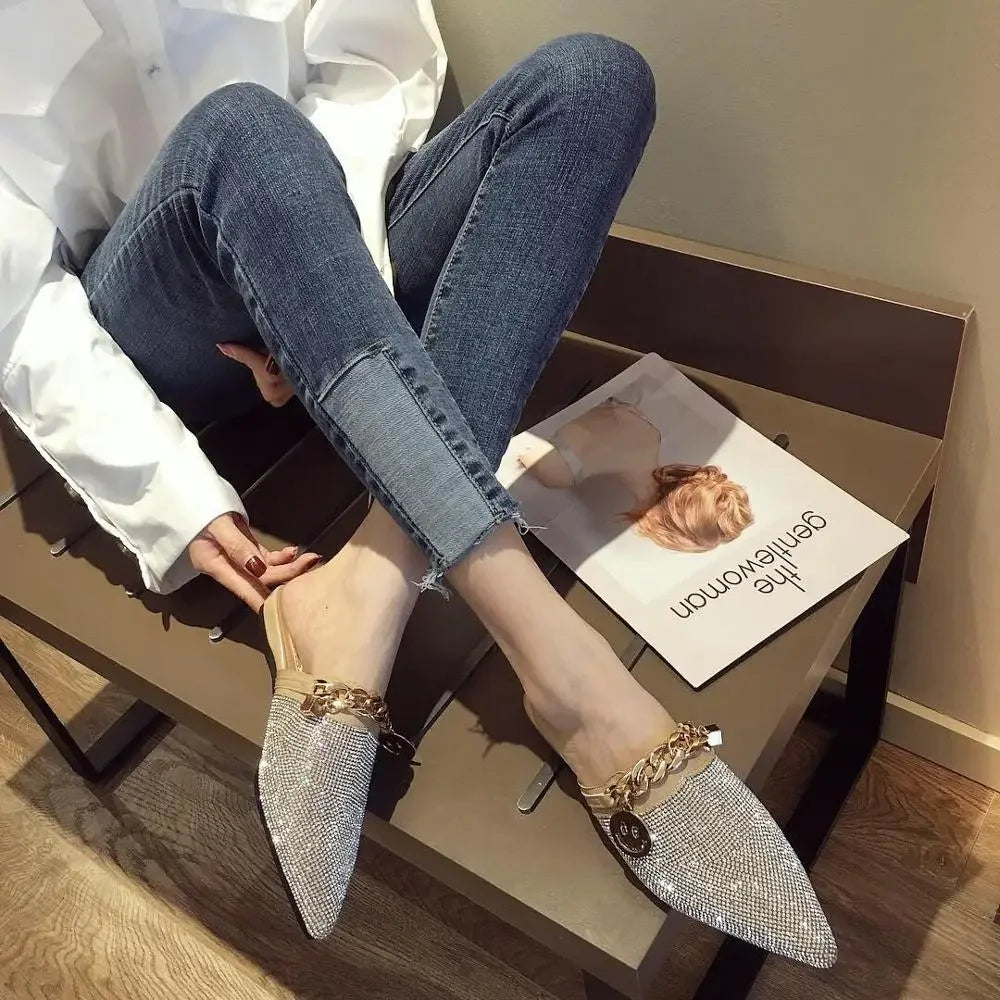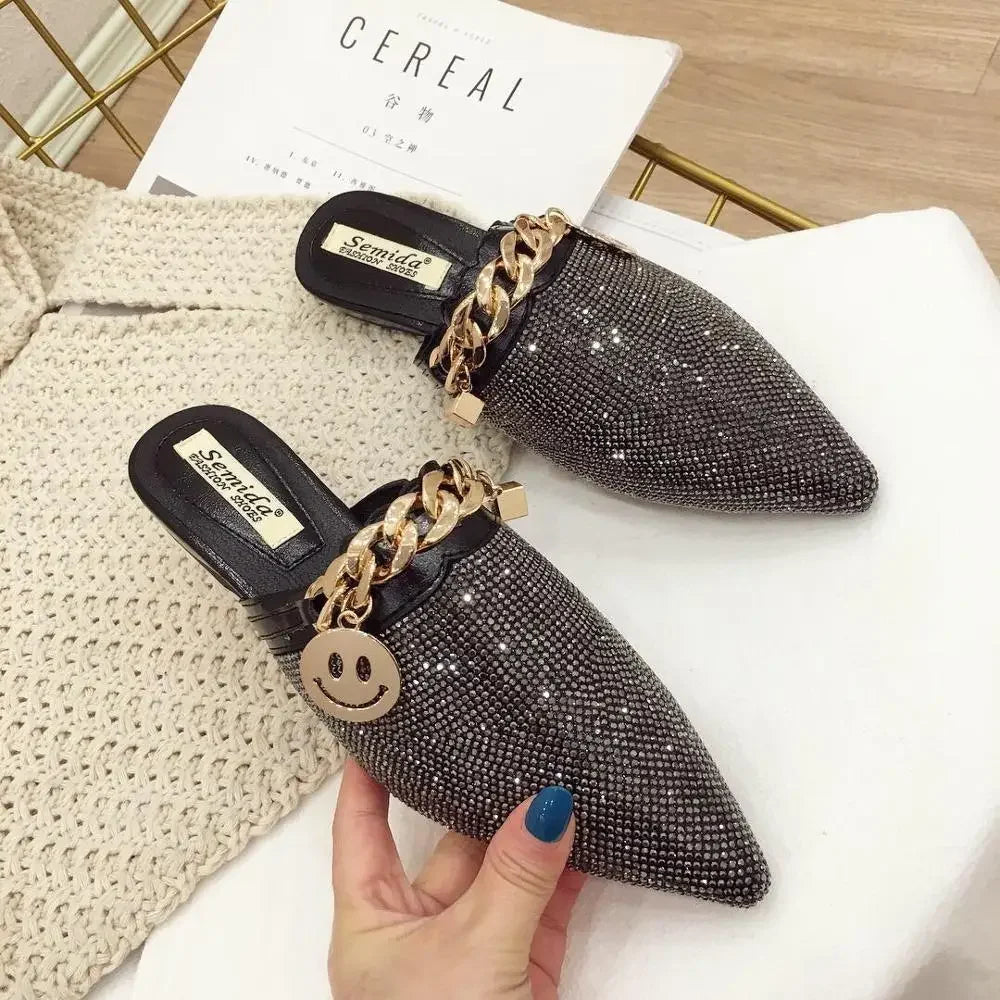 Perfect for evening parties, special occasions, or casual chic looks, they feature sparkling rhinestones and elegant chain details for a fashionable statement. Comfortable and stylish, these slides are the perfect blend of glamour and ease.