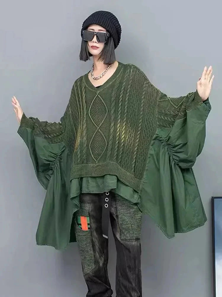 Irregular Big Size Knitting Sweater V-Neck Long Sleeve Women Pullovers