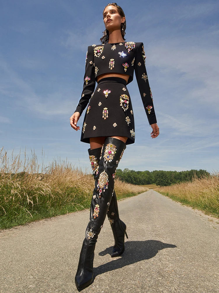Paired with a matching mini skirt, the set embodies high-fashion sophistication with runway appeal. Perfect for parties, events, or elevating your everyday style, this outfit combines elegance and trendsetting design for the confident modern woman.
