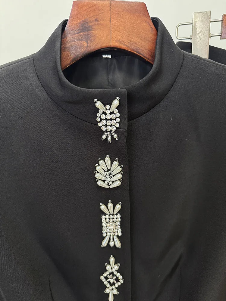2025 Designer Suit Women Beaded Diamonds Stand Collar Jacket Pants Suit 2pcs Set