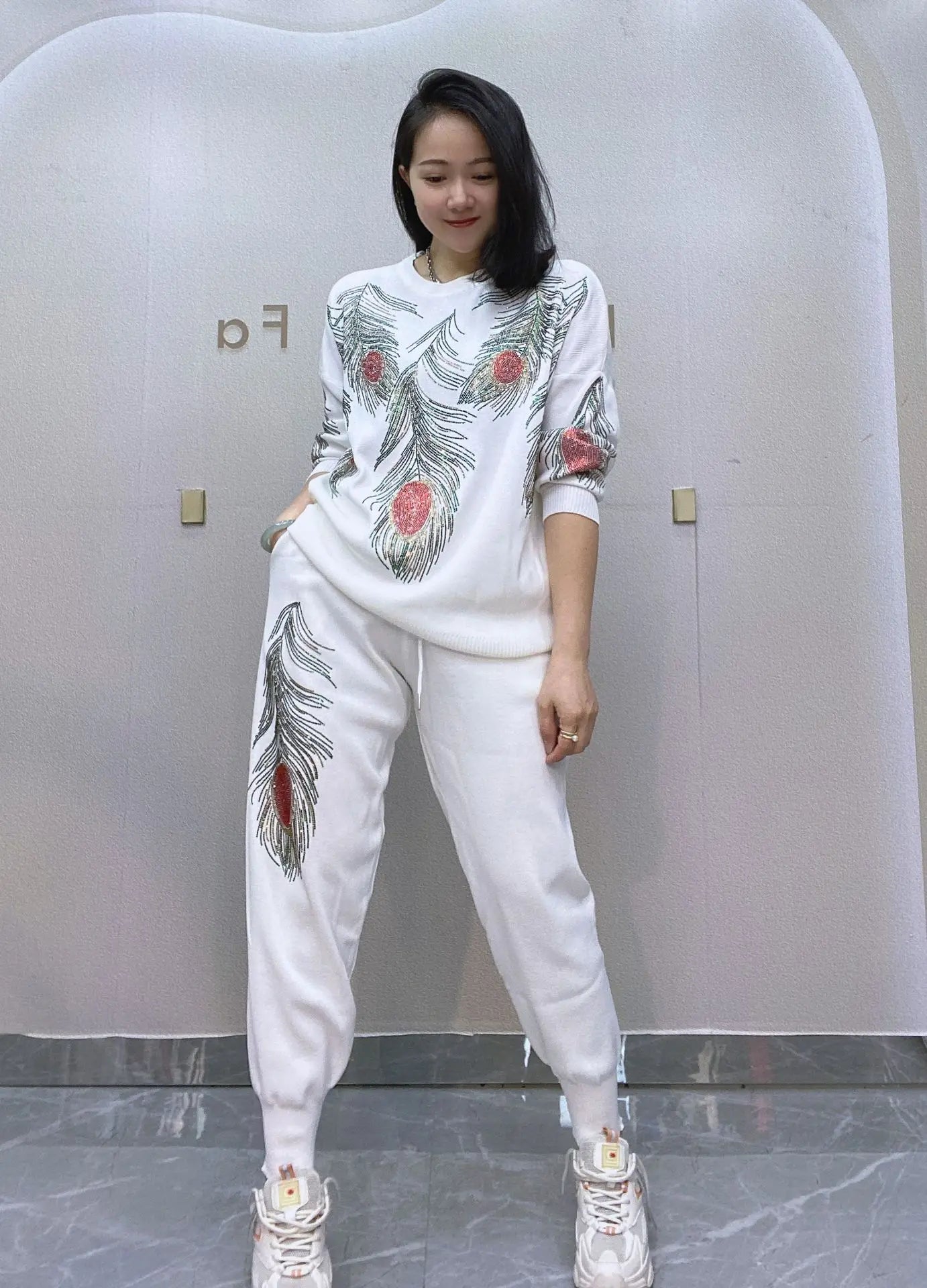 Peacock Feather Beaded Knitted Pullovers Sequined Sweater Set
