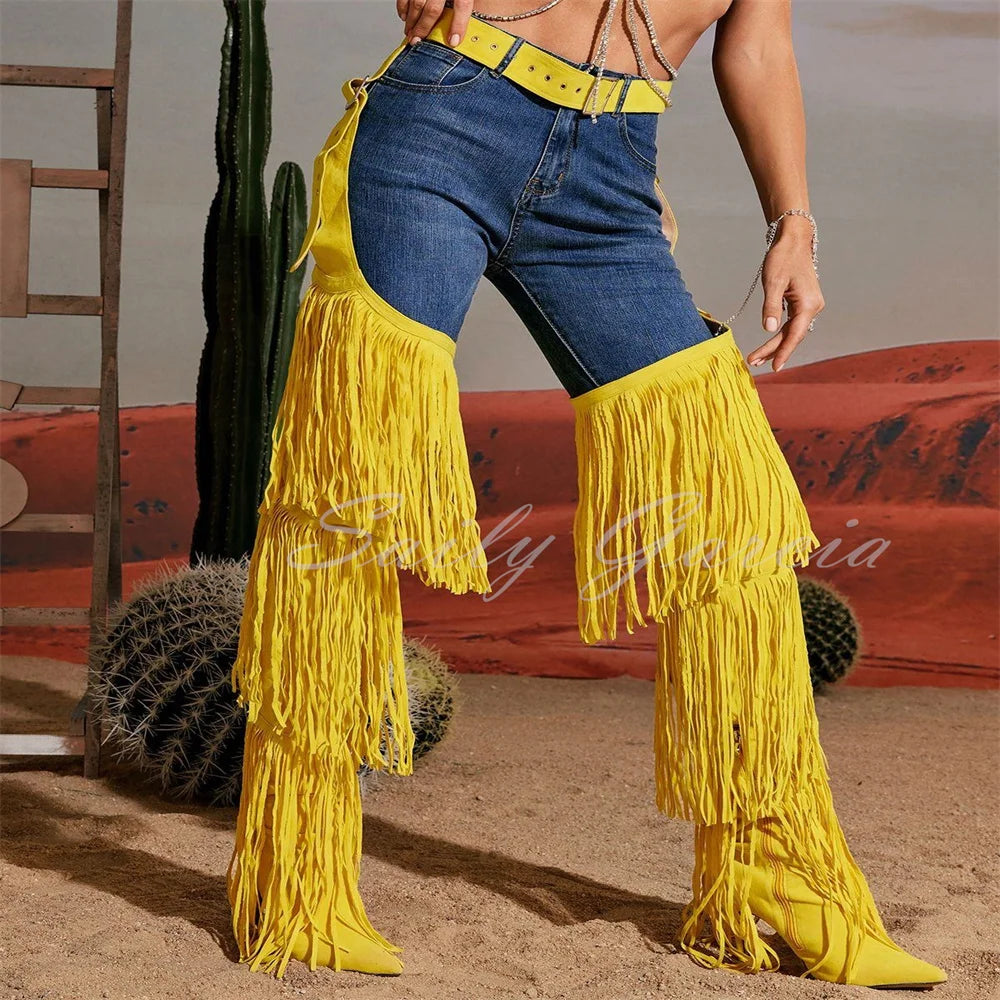 Turn heads with these Fringe High Heel Over-the-Knee Boots for women. Featuring pointed toes, stiletto heels, buckle belt accents, and a convenient side zipper, these long boots are designed for both glamour and edge.